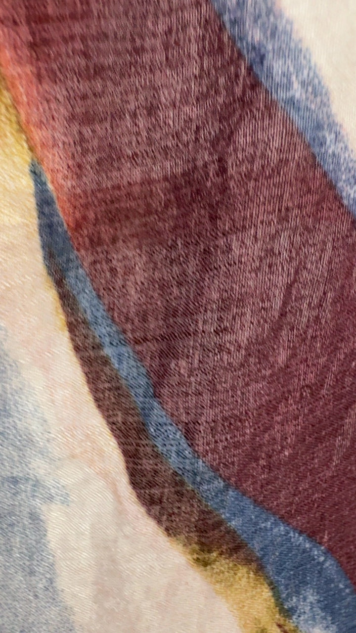 This vibrant blouse features an abstract, swirling pattern with shades of red, blue, beige, and yellow. Designed with sleeve-length and a front tie, it offers a relaxed and stylish look. The lightweight fabric ensures comfort perfect for casual outings or sunny days. Its unique pattern adds a touch of artistic flair to everyday wear.