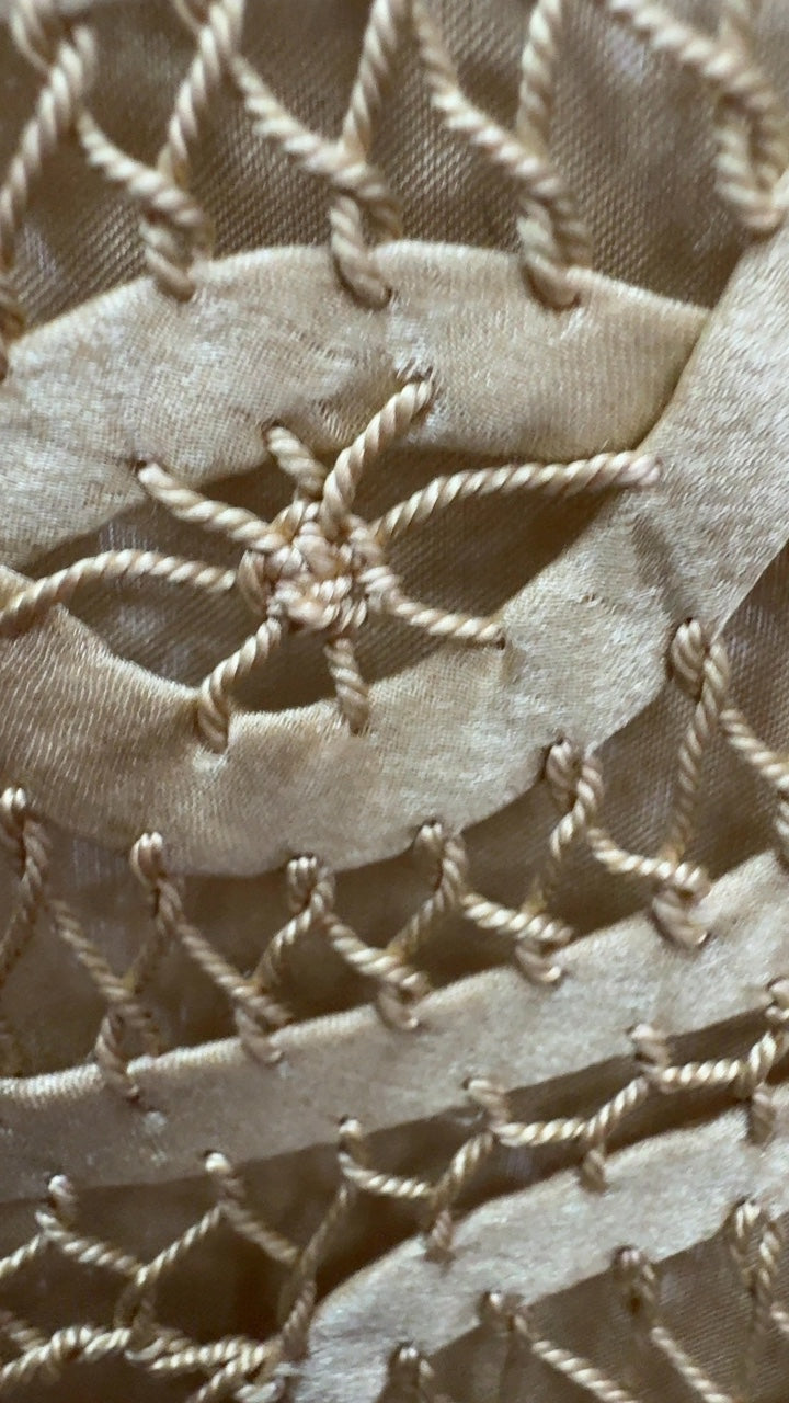Elegant gold lace-embroidered jacket featuring intricate openwork patterns. Perfect for special occasions or enhancing evening outfits. Lightweight and stylish with a sophisticated design. Versatile addition to any wardrobe for a touch of glamour.