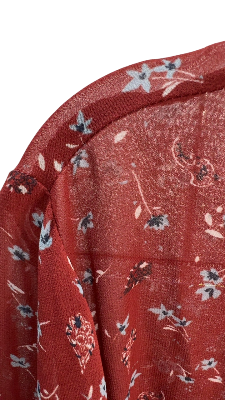 This sheer chiffon top in a warm red hue features a delicate floral print, perfect for summery days or layered looks. The lightweight fabric drapes effortlessly, offering both comfort and style. Its round neckline and subtle ruffle details on the sleeves add a touch of femininity. Ideal for pairing with jeans or skirts for a casual chic vibe.