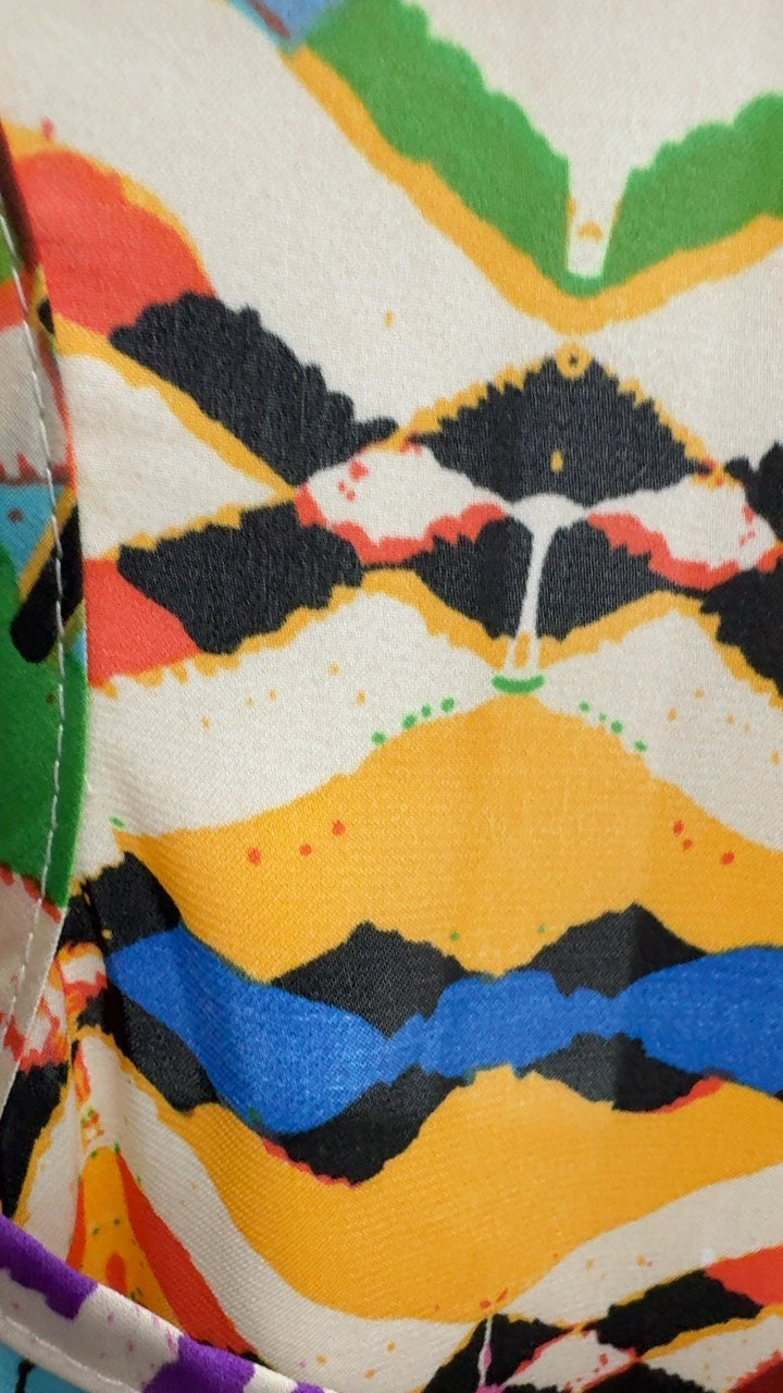 A vibrant, multicolored patterned sleeveless top featuring geometric designs. Perfect for casual outings or summer events, this top offers a lively and eye-catching look. Made from a lightweight fabric for comfort and ease of movement.