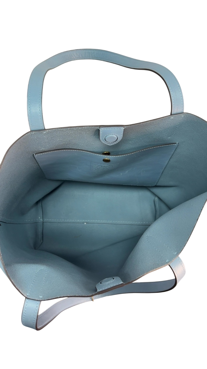This Coach tote bag in a soft blue leather combines sophistication with practicality. Its spacious interior is perfect for daily essentials, making it a versatile accessory for work or weekend outings. The sleek design is complemented by subtle branding details, capturing understated elegance.