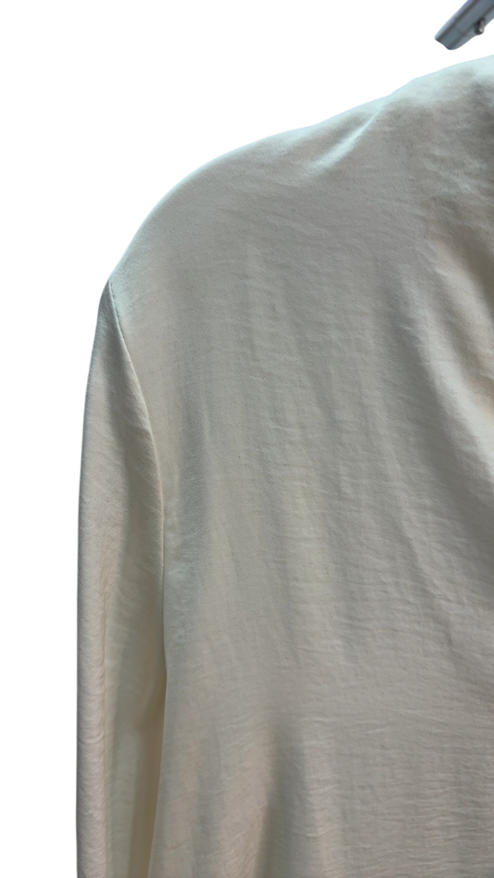 This elegant blouse features a soft cream hue with a subtle sheen. Its relaxed fit and V-neckline give it a sophisticated yet effortless vibe, perfect for both professional and casual looks. Crafted from a silky material, it drapes beautifully, adding a touch of luxury to your wardrobe.