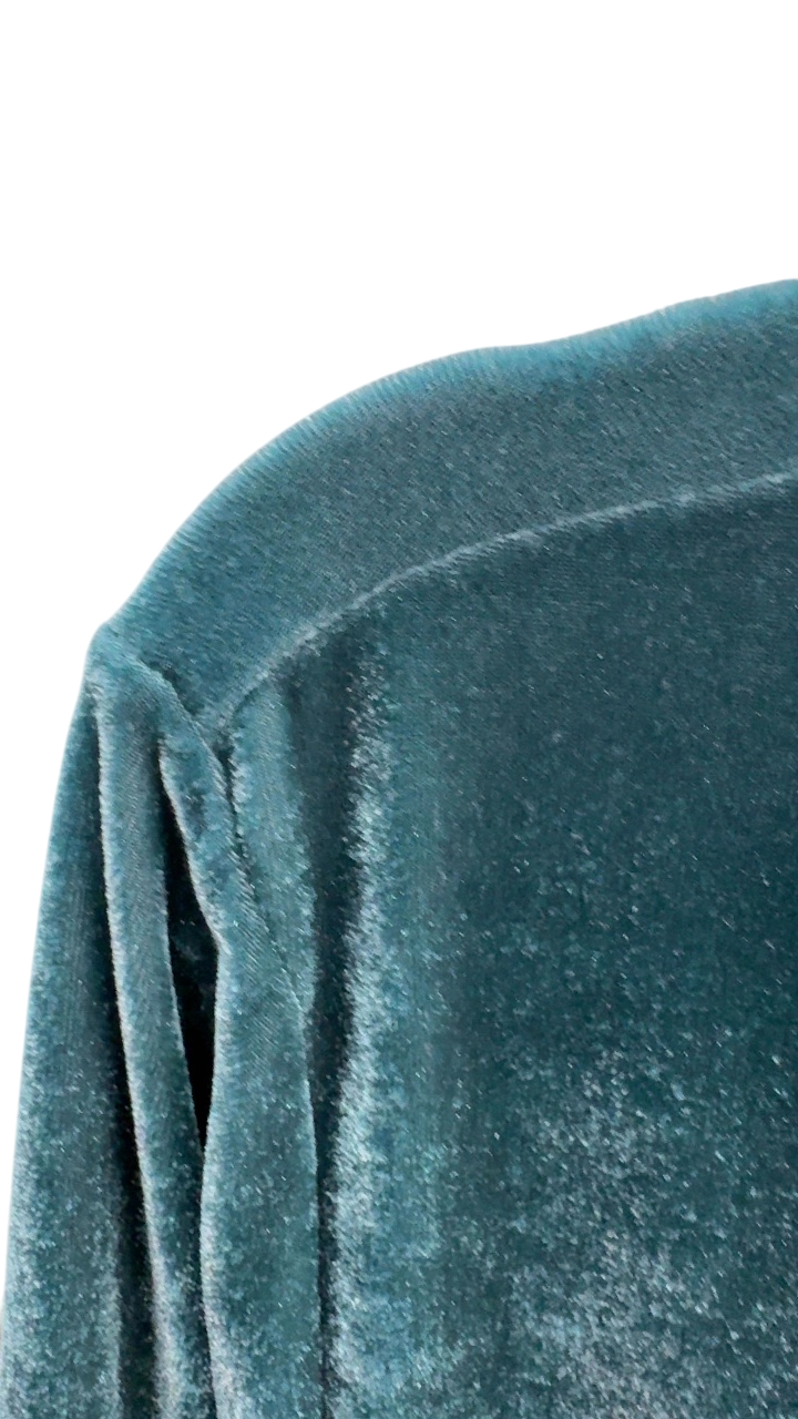 This velvet button-up shirt in teal offers a rich texture and a classic silhouette. Perfect for elevating both casual and sophisticated looks, its soft fabric adds a touch of luxury. The shirt features a traditional collar and long sleeves, making it versatile for different seasons.