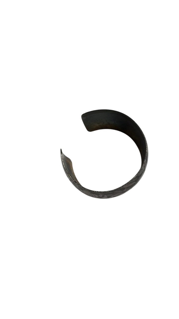 This statement bracelet features intricate carvings that give it an artisanal charm. Its cuff style makes it a versatile accessory for both casual and elegant looks. The dark tones of the bracelet lend it a grounding presence, perfect for layering or wearing alone as a focal point.