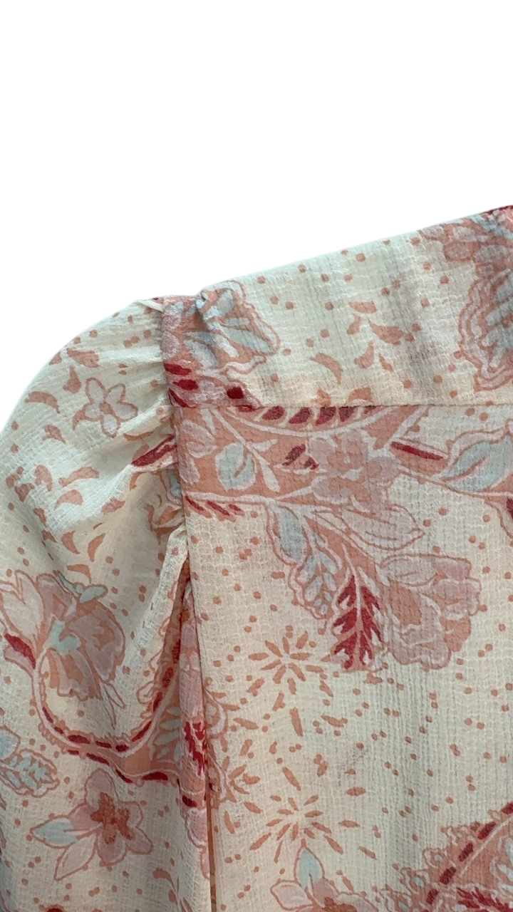 This breezy Torrid outerwear piece features a delicate floral and paisley print, perfect for layering over outfits in warmer weather. Its soft pink accents add a feminine touch, complemented by ruffled trim details at the cuffs and hem for a romantic vibe. The semi-sheer construction offers an airy feel, ideal for casual days or evening outings.