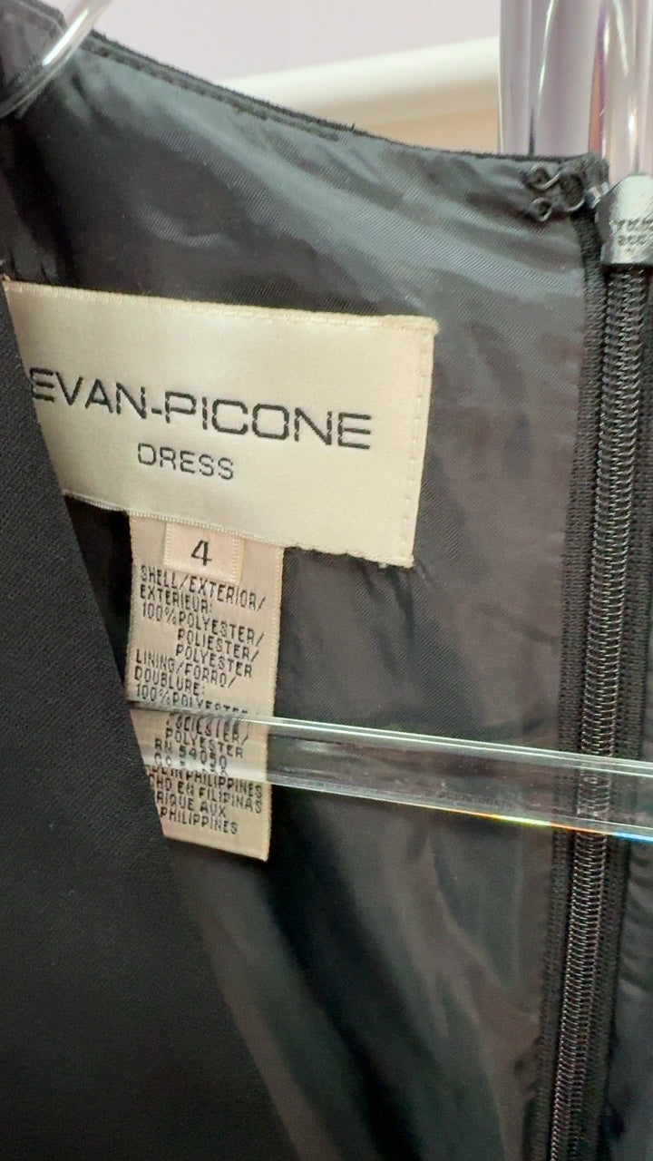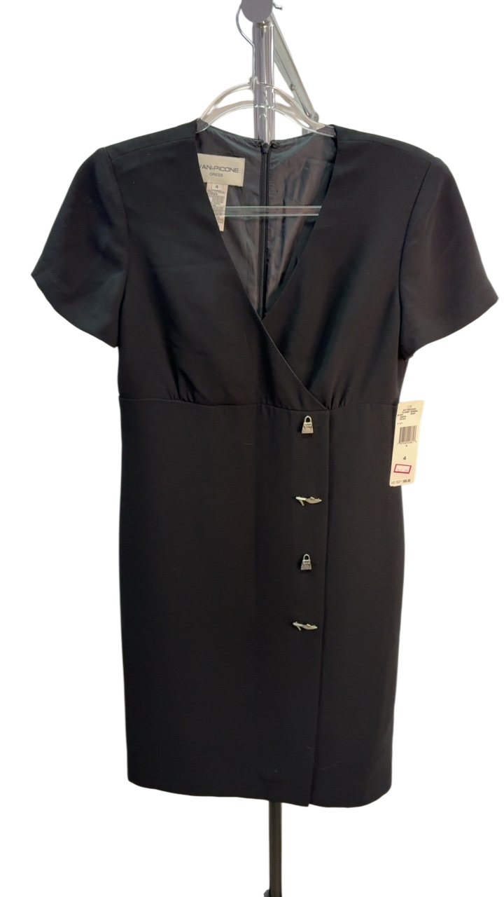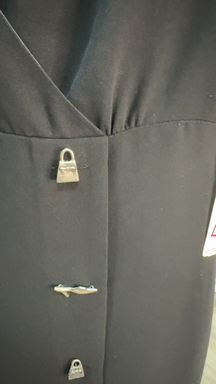 This elegant black dress features a sleek, fitted silhouette with a wrap-style bodice and subtle button embellishments. Perfect for formal occasions or professional settings, it combines classic styling with modern sophistication. The dress is made from a durable, comfortable fabric, tailored to flatter the figure. It offers a timeless look that can be accessorized for various events. The ventless design ensures a crisp, polished appearance.