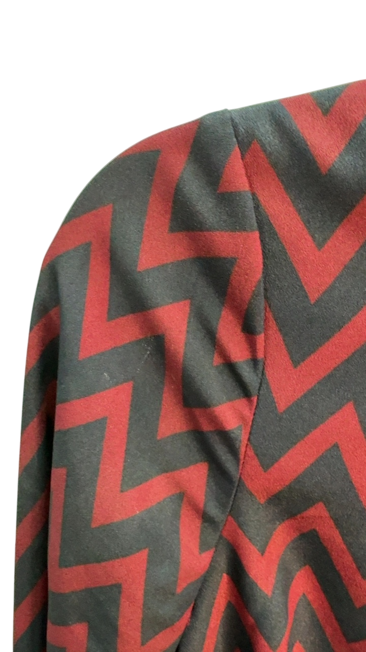 A stylish chiffon dress featuring a vibrant zigzag pattern in navy and burgundy. The dress offers a relaxed fit with long sleeves and a round neckline, perfect for both casual and semi-formal occasions. Its lightweight fabric drapes beautifully, adding a touch of elegance to your wardrobe. An easy-to-wear piece that pairs effortlessly with heels or flats.