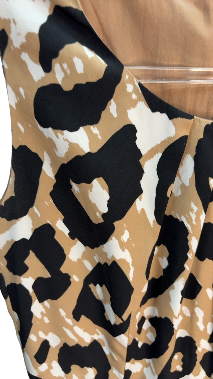 This chic sleeveless dress features a bold leopard print in classic shades of beige and black. Perfect for making a statement at brunch or a summer event, it combines timeless animal print with a sophisticated cut. The dress's lightweight fabric ensures comfort while maintaining a polished look. Its simple silhouette is ideal for pairing with a clutch and heels for effortless style.