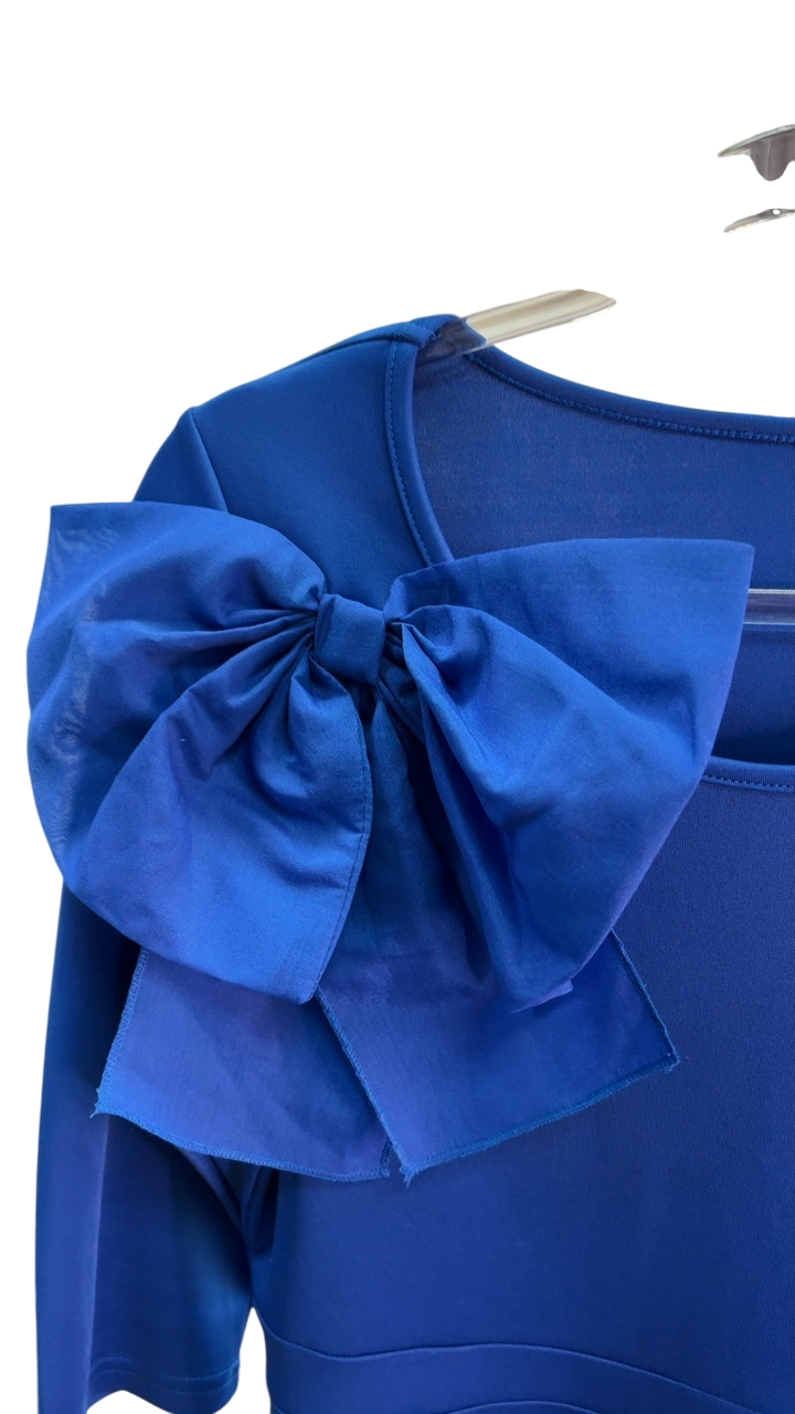 A striking blue dress with three-quarter sleeves and elegant button details on the sleeve cuffs. Featuring a round neckline, this sophisticated piece is perfect for formal occasions or stylish gatherings. The dress has a fitted silhouette that emphasizes a sleek look. The detailing includes a large, decorative bow on the shoulder, adding a touch of unique charm and femininity to the design. It’s a versatile addition to any wardrobe, blending classic elegance with modern flair.