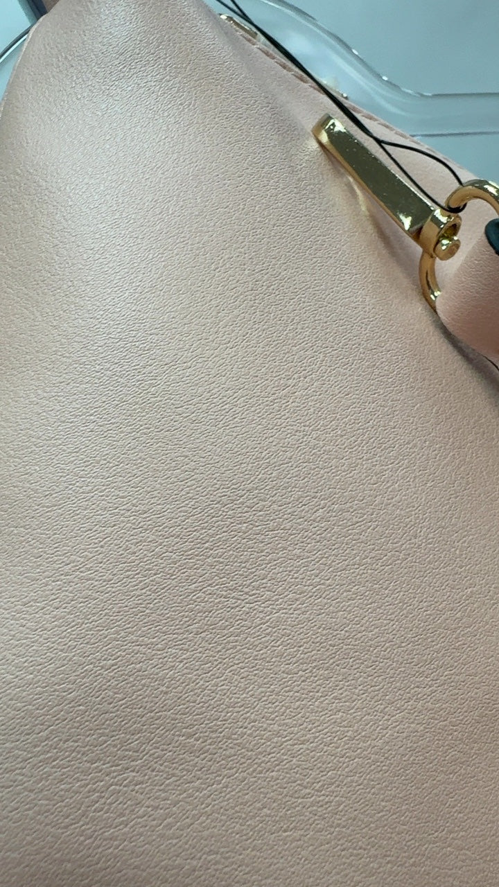 This blush peach handbag features a streamlined design with a detachable strap for versatile wear. Crafted from synthetic leather, its smooth surface adds a sleek touch to casual and dressy outfits. Gold-tone hardware enhances its elegant look, making it suitable for various occasions. Compact yet spacious enough for essential items, it combines functionality with style.
