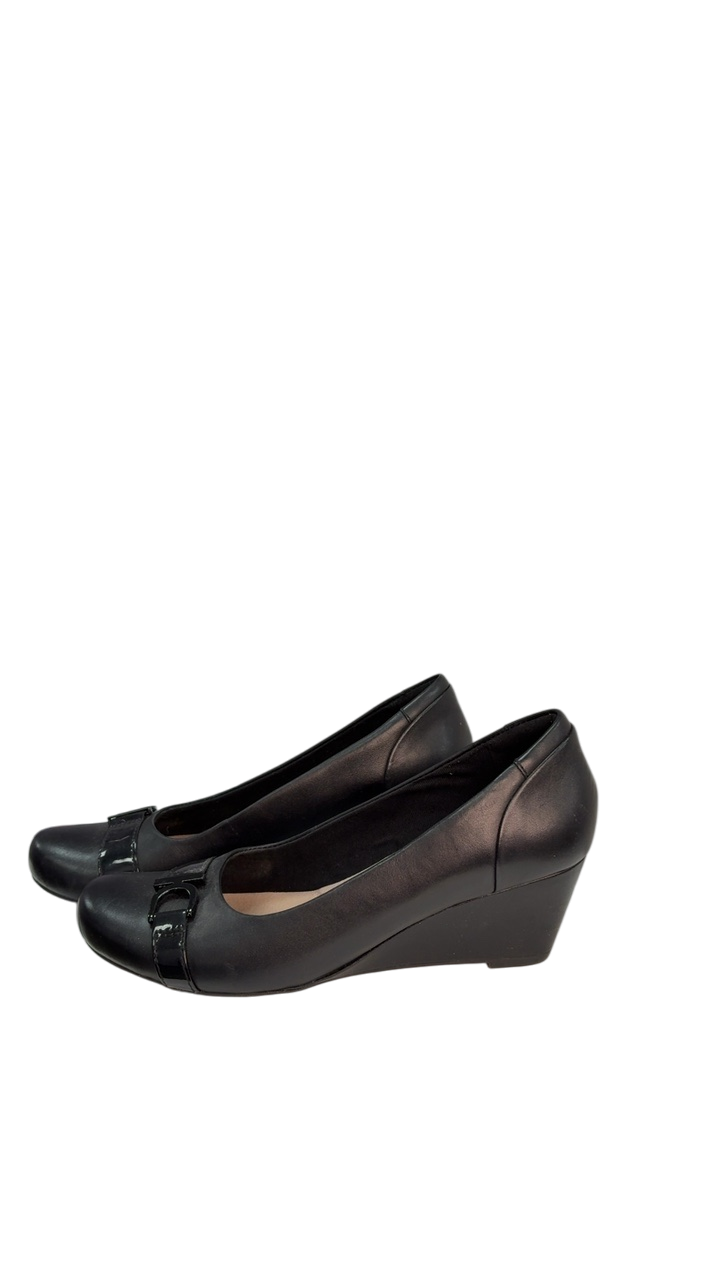 These chic black ballet flats from Clarks showcase a sleek leather upper accented with a stylish bow detail. Perfect for everyday elegance, they combine comfort with subtle sophistication. The cushioned insole promises all-day wearability, making them a versatile addition to any wardrobe.