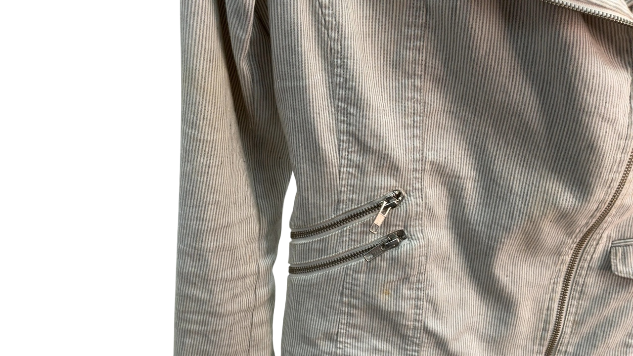 This soft striped jacket offers a timeless and versatile style perfect for casual outings. Its tailored fit and stylish lapel collar add a touch of sophistication to any outfit. The front zipper and side pockets provide both functionality and flair. Suitable for layering over your favorite tops, it combines comfort with effortless elegance.