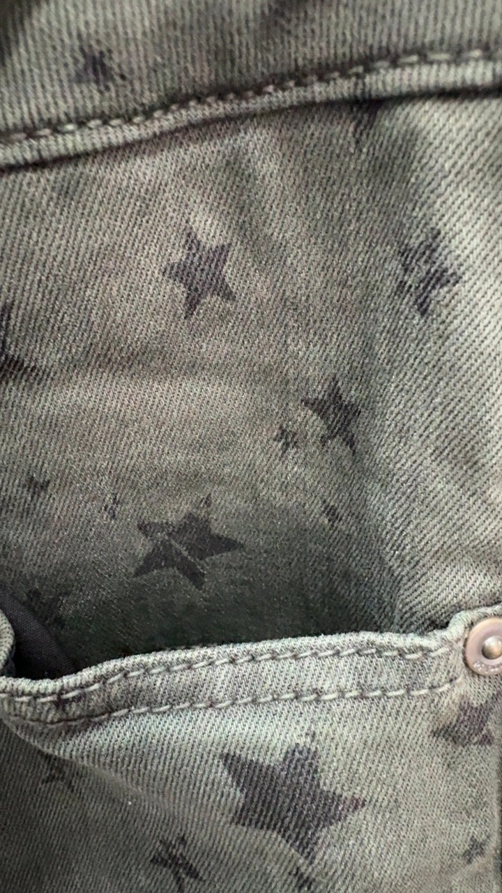 Stylish olive green jeans featuring an all-over black star pattern. Crafted from durable denim fabric, these pants combine comfort with a trendy design. Perfect for casual outings or adding a bold touch to everyday wear.