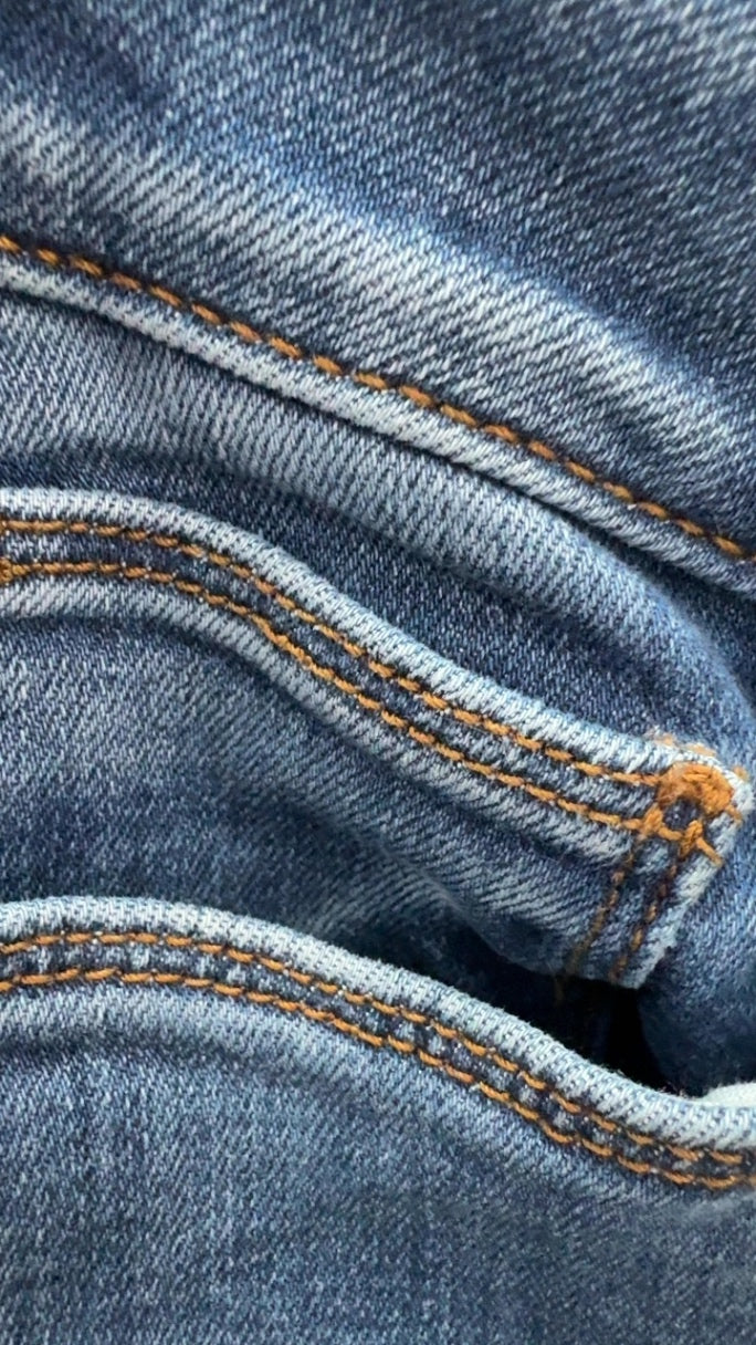 Classic blue denim jeans with a slightly faded finish. Features traditional five-pocket styling and a cuffed hem for a casual look. Perfect for everyday wear or casual outings.