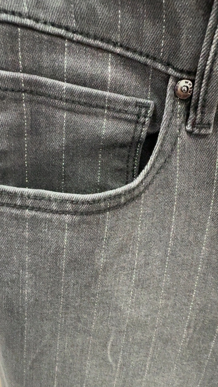 Stylish dark gray pinstripe jeans featuring a classic five-pocket design. Made from durable denim fabric, these jeans offer a comfortable fit with a modern edge. Perfect for casual or semi-formal wear, they pair well with a variety of tops and footwear.