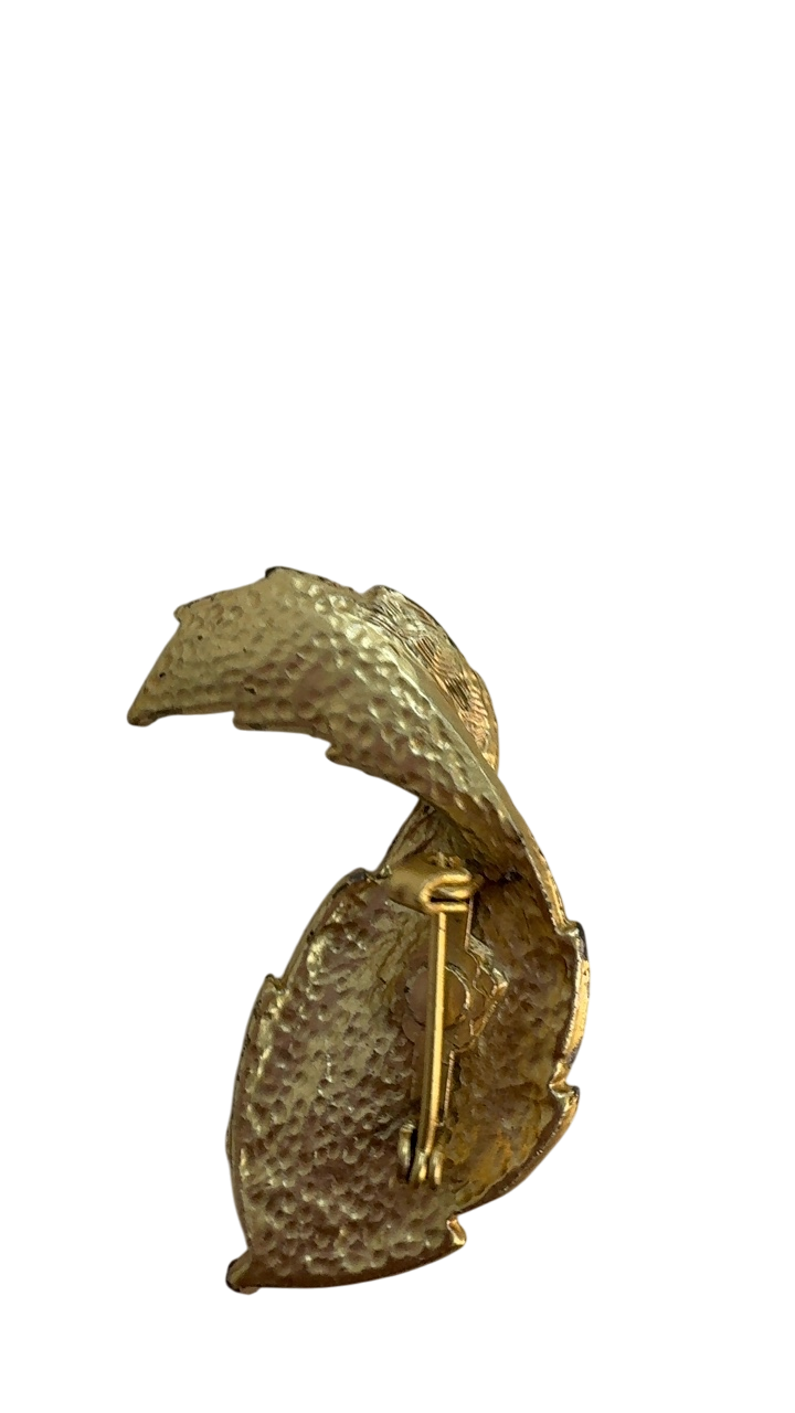 A striking gold-tone brooch shaped like a feather, detailed with intricate engravings that mimic the natural veins of a leaf. The elegant design is accentuated by a row of small gemstone embellishments along one side, adding a touch of sparkle. Perfect for elevating evening wear or adding a refined detail to everyday outfits. Its lightweight structure makes it easy to pin on blouses, jackets, or scarves for versatile styling.
