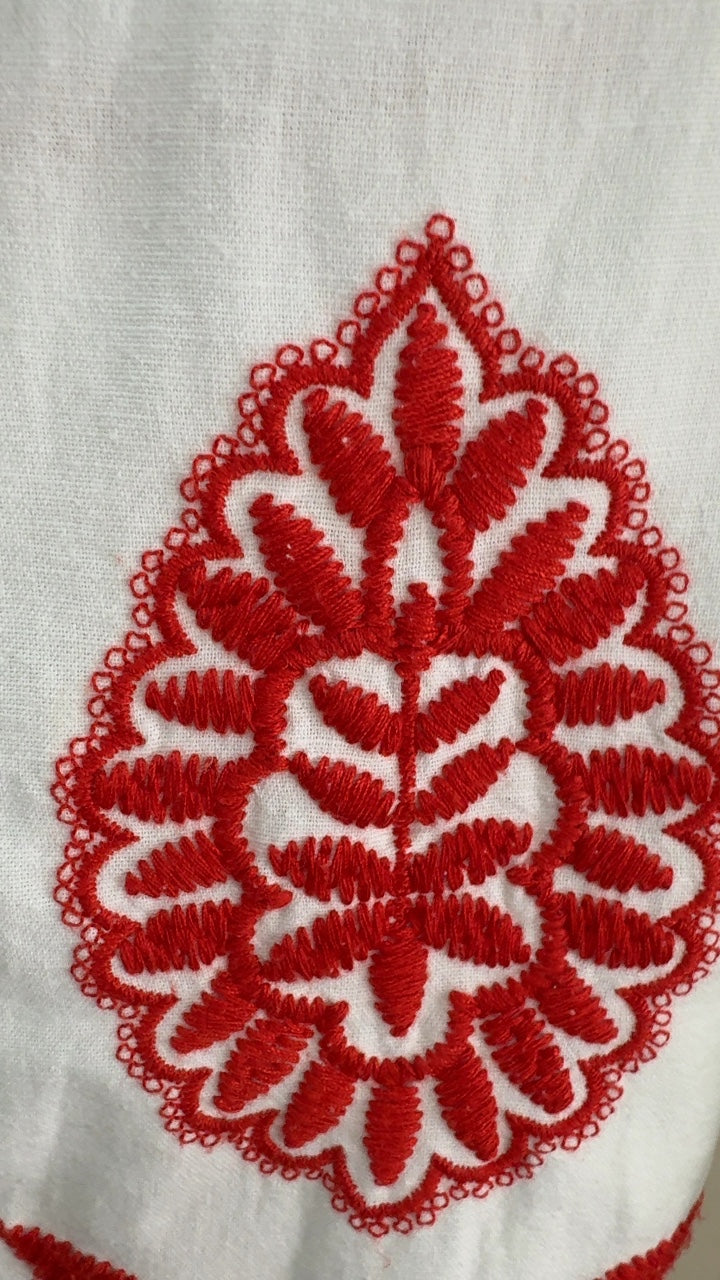 This elegant blouse features intricate red embroidery on classic white cotton fabric, giving it a vibrant yet sophisticated look. The design includes floral and paisley motifs, perfect for adding a touch of ethnic charm to your wardrobe. It has a round neckline and button-down front for a comfortable fit. Ideal for festive occasions or casual outings where you want to make a subtle style statement.