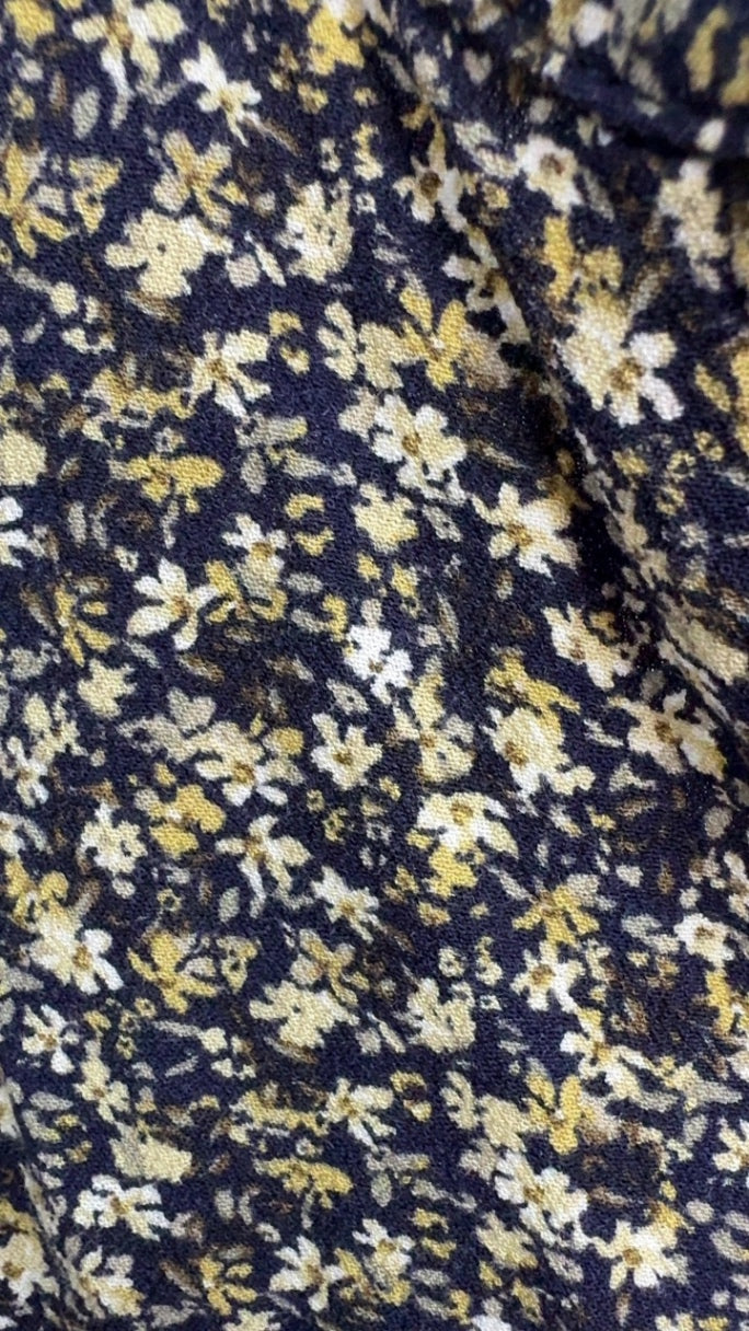 This blouse features a delicate floral print with small yellow and white flowers on a black background. Its flowy fabric and ruffled cuffs add a touch of femininity, making it ideal for both casual and semi-formal looks. The round neckline with a slight V detail offers a comfortable fit. Versatile and stylish, it pairs beautifully with jeans, skirts, or trousers for a chic ensemble.