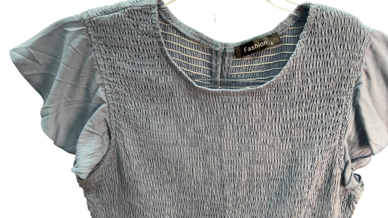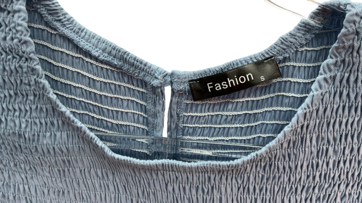 This light blue maxi dress features a gathered skirt and a fitted bodice with intricate textured details. The elegant design combines comfort with a touch of sophistication, perfect for summer occasions or casual outings. Its soft fabric ensures a flattering drape, making it a versatile addition to any wardrobe.