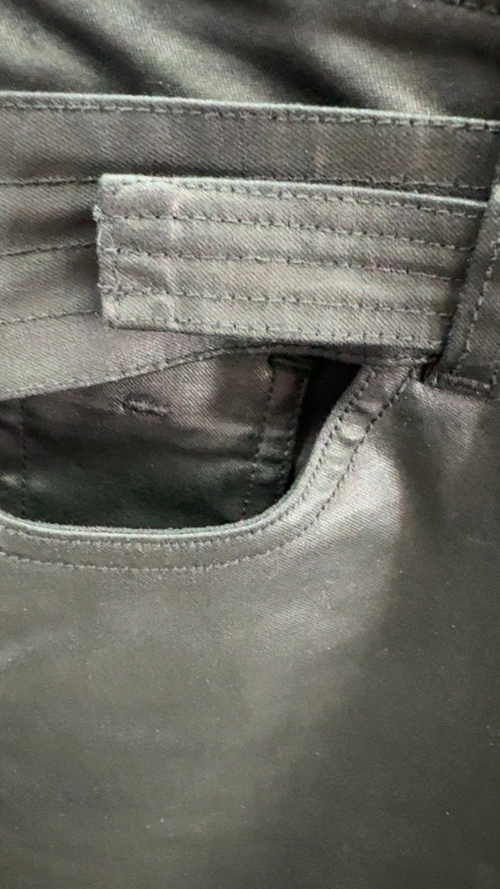 These sleek black pants offer a modern twist on classic style. Perfect for a night out or a chic casual look, they hug the body with a fitted silhouette. The subtle sheen adds a touch of sophistication, making them versatile enough for various occasions. Pair with a blazer or a casual top for effortless style.