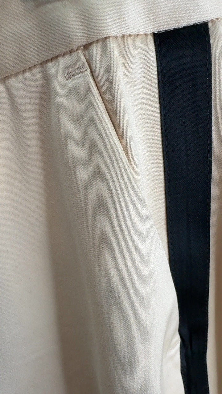These stylish beige trousers are perfect for a smart-casual look. Crafted with a comfortable fit and featuring a sleek black stripe along the sides, they add a touch of modern elegance to any wardrobe. Ideal for both office wear and weekend outings, they combine contemporary design with everyday functionality.