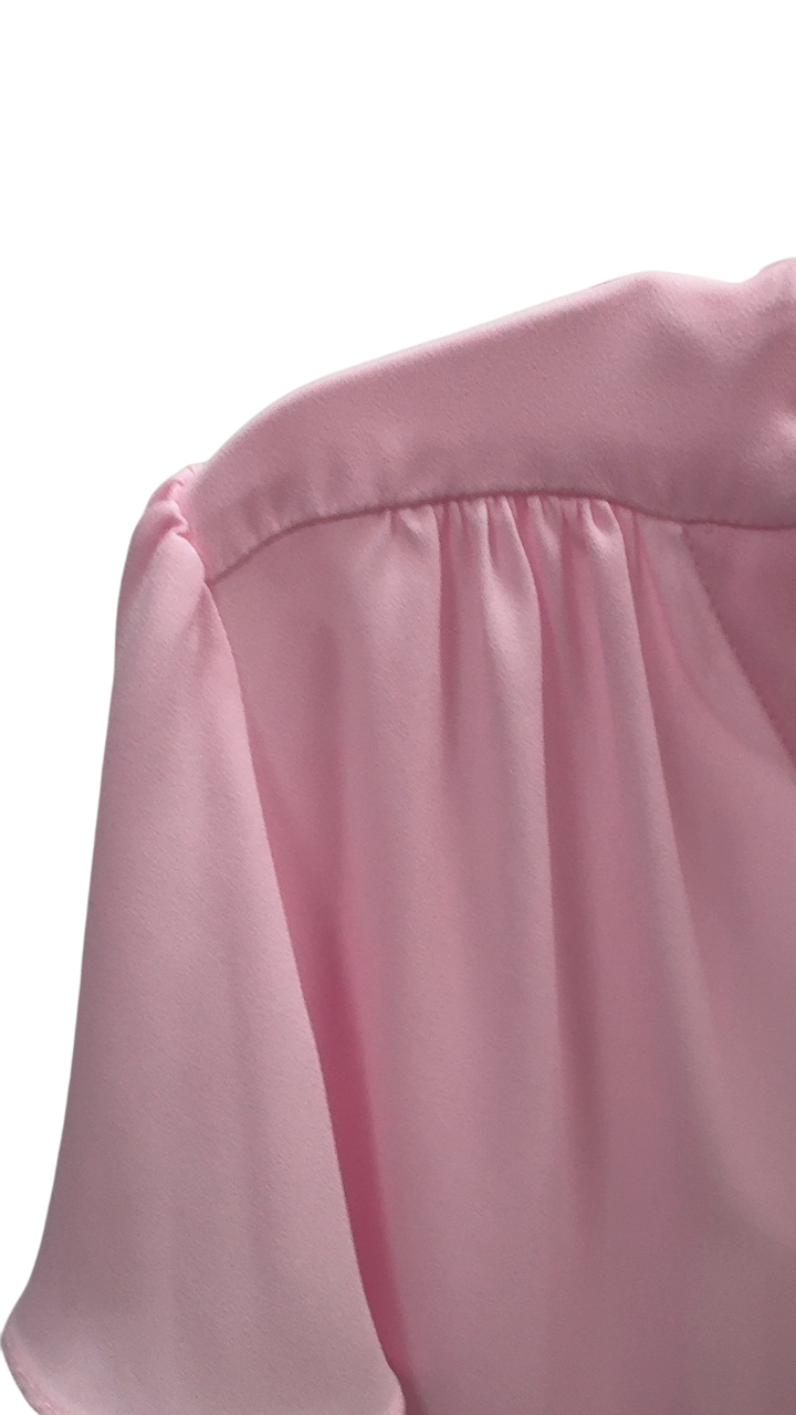 This delicate pink blouse offers a soft, luminous sheen, perfect for adding a touch of elegance to any outfit. Designed with a subtle V-neckline and short flutter sleeves, it combines comfort with a refined silhouette. Versatile and lightweight, it can be styled effortlessly for both casual and formal occasions. An ideal choice for those looking to enhance their wardrobe with a feminine and sophisticated piece.