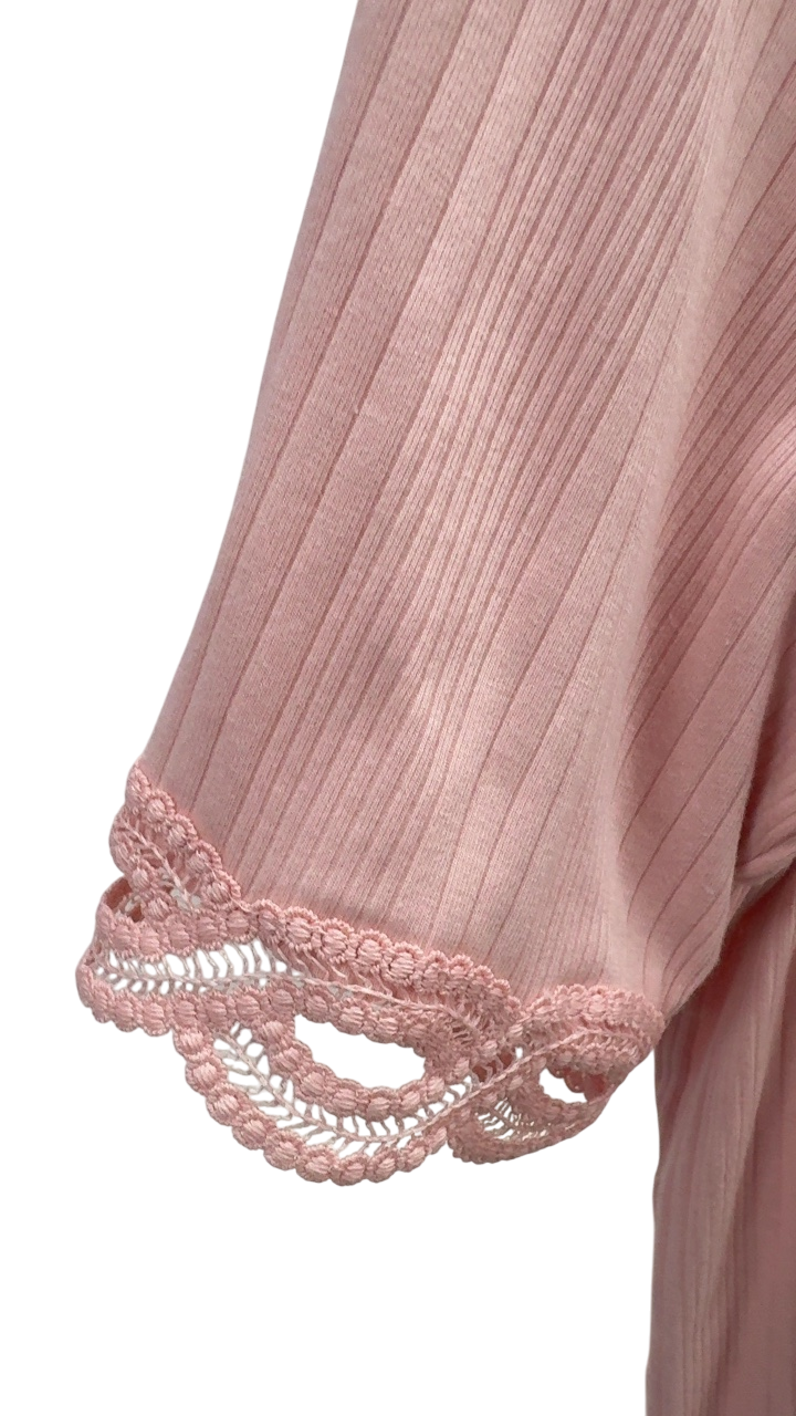 This soft pink top by TALBOT'S features a ribbed texture that adds subtle dimension to a classic silhouette. The rounded neckline and puff sleeves with delicate lace trim combine comfort with feminine charm. Perfect for a casual day out or layered under a blazer for a chic office look.