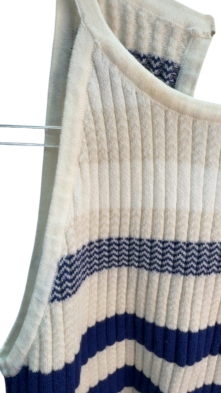 A chic sleeveless knitted top featuring elegant cream and navy blue horizontal stripes. The ribbed texture adds a touch of casual sophistication, perfect for layering or wearing as a statement piece on its own. Its versatile design makes it suitable for both daytime outings and evening events.