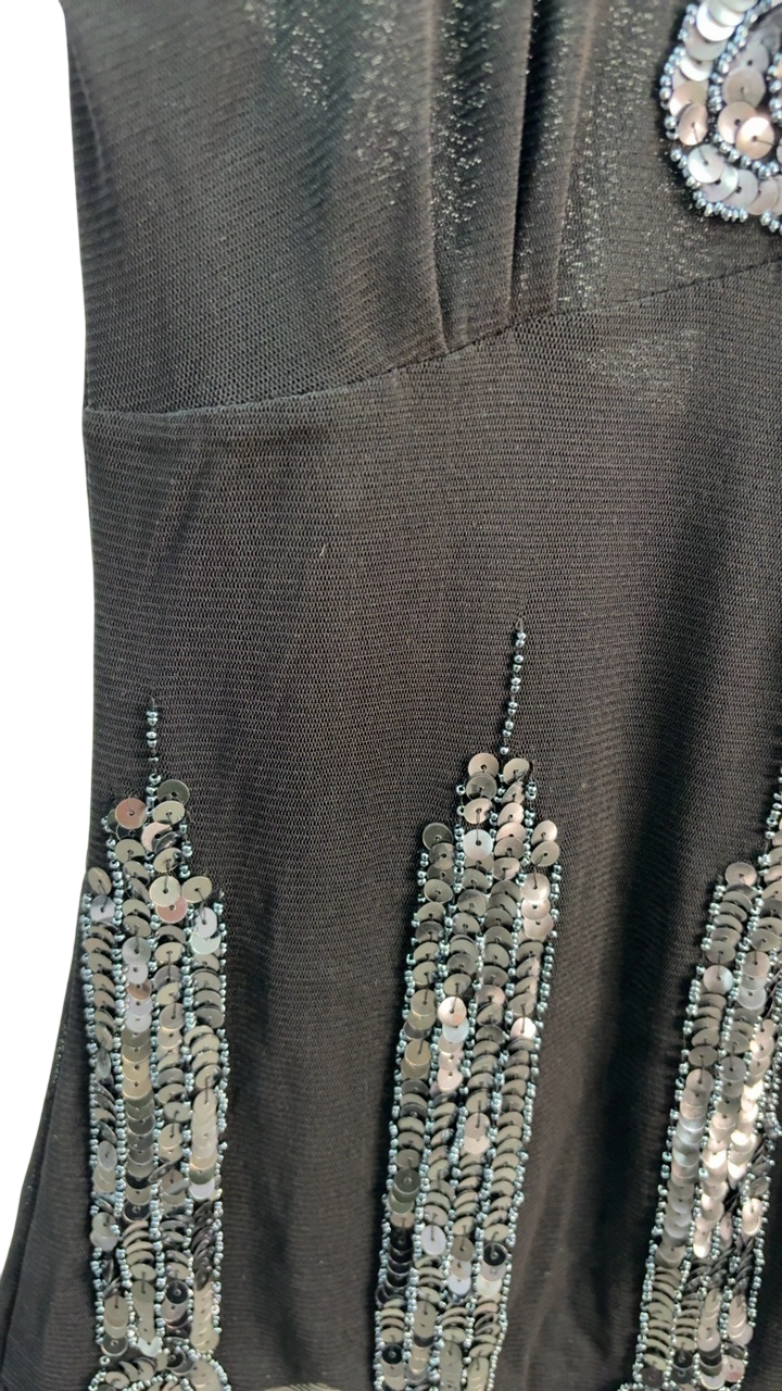 This stylish black top features a deep V-neckline adorned with intricate sequin embroidery, adding a touch of glamour. The sleeveless design makes it perfect for night outs or special occasions. Its fitted silhouette enhances a chic silhouette. The sequins create a sparkling effect, elevating the overall look. A versatile piece that pairs well with skirts or trousers for an elegant ensemble.