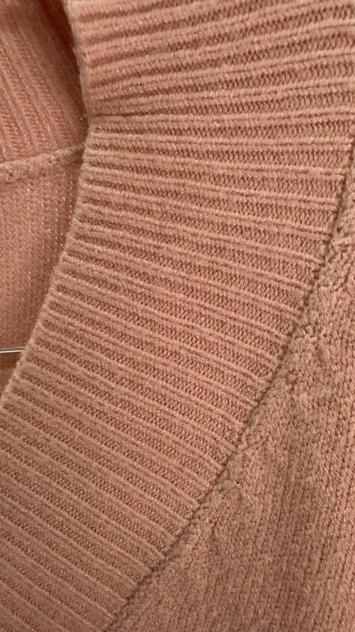 A cozy peach-colored sweater featuring a classic V-neck and ribbed accents at the collar, cuffs, and hem. Its relaxed fit makes it perfect for layering during cooler days, adding a touch of softness to casual outfits. Made from a wool blend, it offers both warmth and comfort with a refined appearance.
