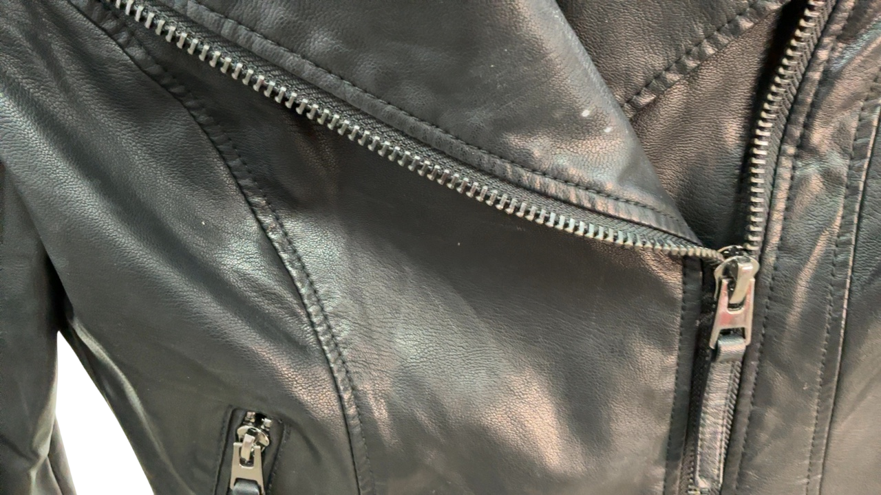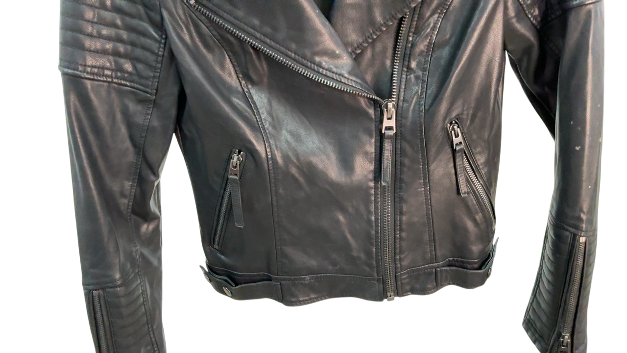 This black leather jacket from Topshop combines edgy style with timeless appeal. Perfect for elevating casual looks, it features quilted detailing on the shoulders and sleeves, along with silver-tone hardware that adds a touch of rebellious chic. With a fitted silhouette and zippered pockets, it’s a versatile piece that effortlessly upgrades your wardrobe.