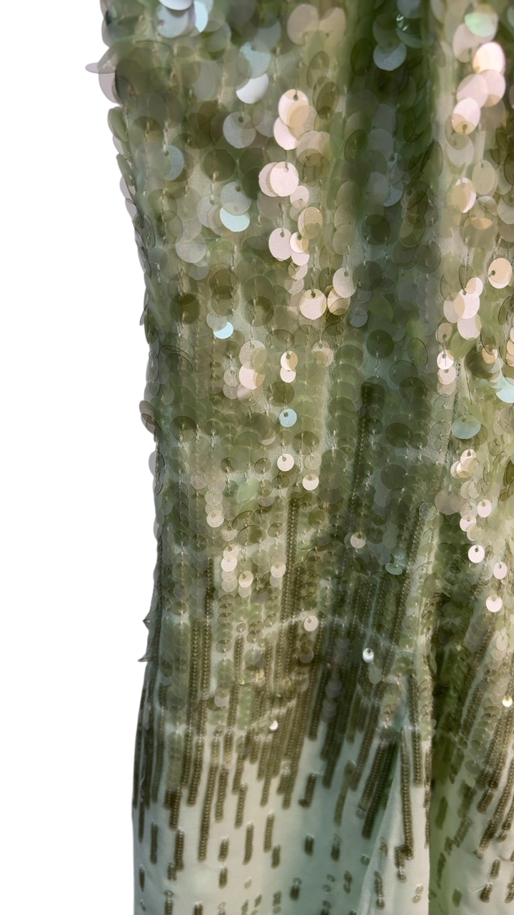 This stunning green dress is adorned with shimmering sequins that create a dazzling effect. The spaghetti straps and fluid silhouette make it perfect for party nights or special occasions. Designed by Halston, it combines modern glamour with comfortable fit. The sequined detailing enhances an elegant and eye-catching look.