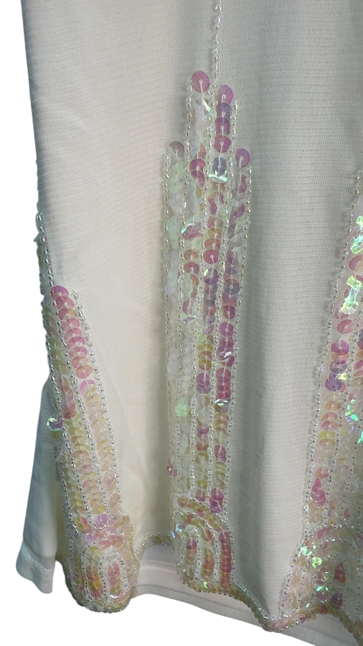 This elegant sleeveless top features intricate sequin embellishments along the neckline and front, adding a touch of shimmer and sophistication. Its soft cream hue makes it versatile for both day and evening wear. The delicately tied neck detail enhances its feminine silhouette, making it perfect for special occasions or upscale events.