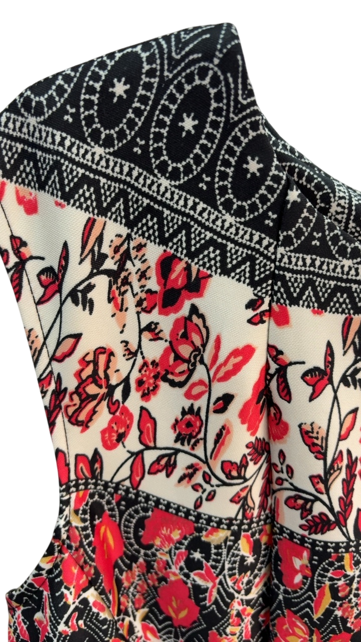 This vibrant dress features an intricate floral pattern with a boho-chic vibe. The dress combines contrasting black and colorful prints, creating a lively and eye-catching look. Its loose fit offers comfort and ease, perfect for casual outings or summer days. The detailed design and playful pattern make it a versatile choice for a fun, feminine wardrobe.