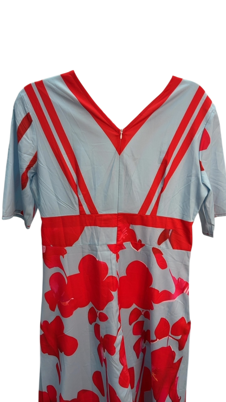 A vibrant, eye-catching maxi dress featuring a striking red floral pattern on a light blue background. The design includes bold lines and a deep V-neckline, perfect for summer outings or garden parties. Its flowing silhouette offers both comfort and style, blending casual charm with a touch of sophistication.