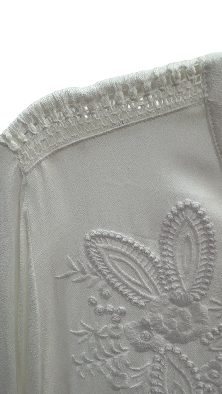 This elegant white silk top features intricate embroidery and delicate pearl-like buttons down the front. Perfect for a sophisticated casual look or dressier occasions, it combines comfort with stylish detailing. The embroidered floral motifs add a touch of femininity, while the silky fabric lends a smooth, luxurious feel.