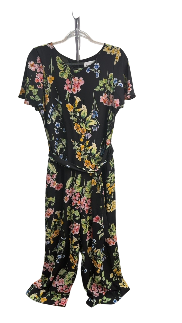 This floral jumpsuit features a flowing silhouette with short sleeves and a waist tie. The vibrant flower print stands out against the black background, giving it a lively yet elegant vibe. Perfect for spring or summer outings, it offers a blend of comfort and style. Its relaxed fit makes it easy to wear from daytime events to evening gatherings.