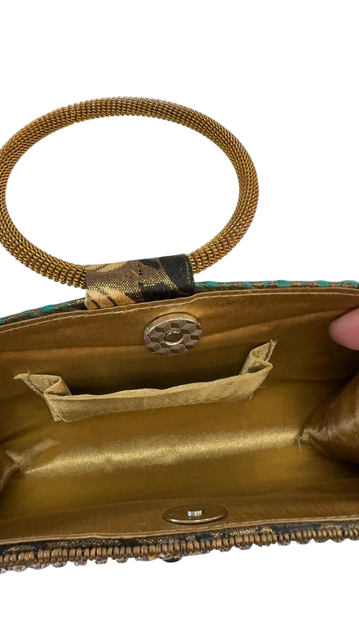 This embellished handbag combines a rich tapestry of colorful fabric with intricate metal and rhinestone details. Its ornate design is perfect for adding a touch of luxury to special occasions. The rounded shape and decorative patterns make it a standout accessory, blending classic elegance with a bold statement.