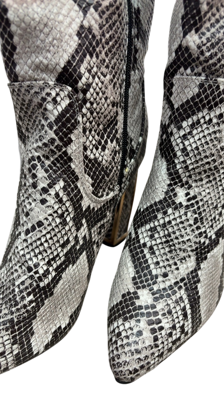 Make a bold statement with these knee-high snakeskin-pattern boots. Crafted from sleek leather, they showcase a striking animal print that adds a fierce edge to any outfit. The pointed toe and high heel create a chic silhouette perfect for both day and night looks. These boots are an eye-catching addition for those who love to stand out.