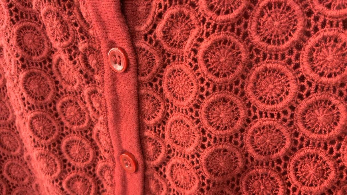 This red cardigan from Express features a textured circular pattern on the front. Made with a soft, lightweight fabric, it combines classic style with modern details. Perfect for adding a pop of color to any casual or semi-formal outfit, this piece offers both comfort and versatile fashion appeal.