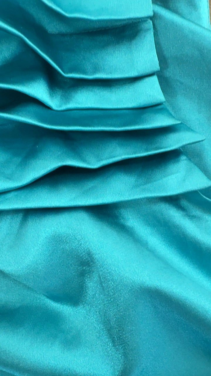 This stunning satin top in a vibrant turquoise makes a bold statement. Designed with a textured ruffle detail at the shoulder, it adds a touch of elegance and femininity. The smooth sheen of the satin fabric enhances its luxurious appeal, perfect for special occasions or upscale gatherings.