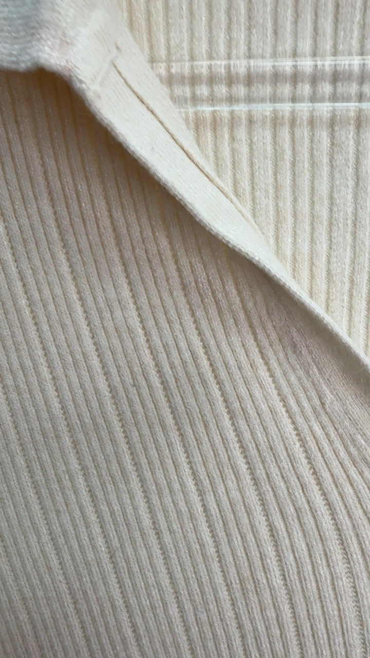 This cozy beige knit top features a relaxed fit with a subtle V-neckline and a ribbed texture throughout. Perfect for layering or wearing alone for a casual yet polished look. The soft fabric offers comfort and style for everyday wear.